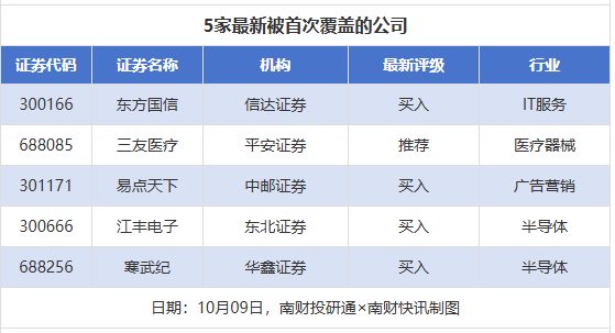 首次覆盖方面,10月9日券商共给出了5次首次覆盖,其中东方国信)