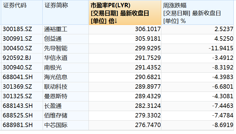 本周两个交易日,中芯国际、佰维存储、先导智能分别累计下跌14.69%、7.48%、11.94%,下跌之后,这些股票静态市盈率有所下降。