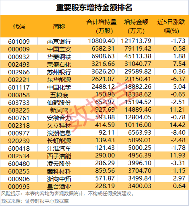 从增持金额看,近5日增持金额在1亿元以上的有12家,增持金额最多的是南京银行,其间累计增持1.08亿股,增持金额合计12.17亿元;其次是中国宝安)