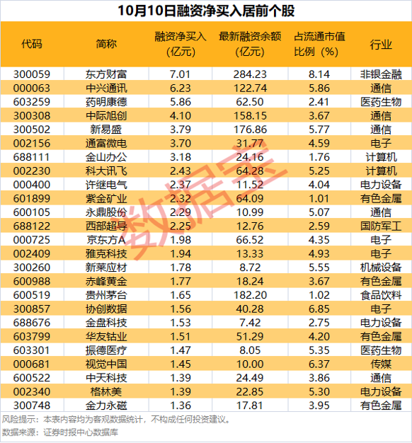 具体到个股,10月10日获融资净买入1亿元以上的有45只,其中12股融资净买入额均超2亿元。