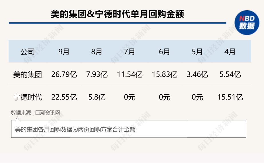 href=/600031/>三一重工(600031)和海尔智家 data-match-index=0>海尔智家等,回购金额分别为:71.09亿元(两期回购方案合计)、43.86亿元、30.5亿元(两期回购方案合计)、13.55亿元和10.17亿元;9月单月分别回购了26.79亿元、22.55亿元、0.17亿元、零元和1.18亿元。这些公司都是在4月的回购浪潮前后发布的回购预案,目前累计回购金额均已超过各自的拟回购金额下限。尤其是美的集团 data-match-index=2>美的集团和宁德时代两家公司,9月单月回购金额均超过20亿元,领衔单月回购金额之最。