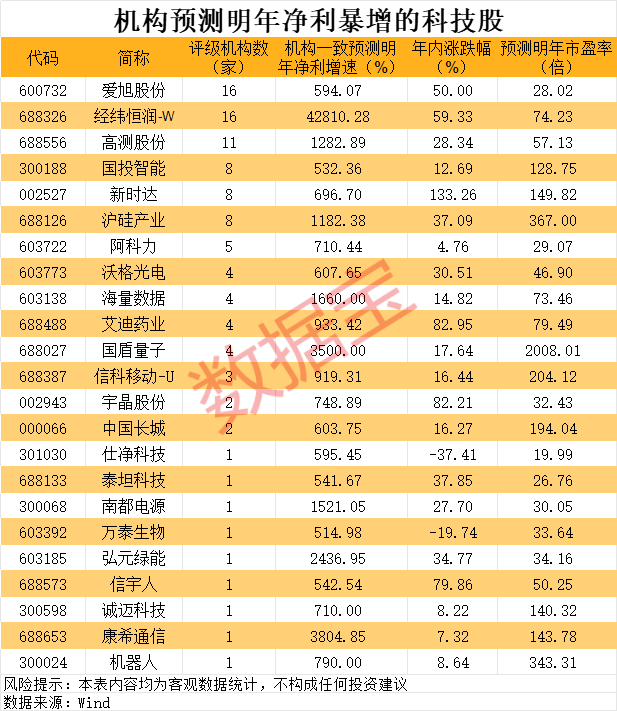 未来业绩能否兑现或许是决定这些科技股能否持续强势的关键。相对来说,机构关注度越高的个股,实现业绩的可能性或许更大。其中,经纬恒润-W、爱旭股份)