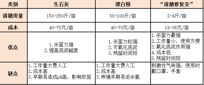 常用清塘消毒产品有生石灰、漂白粉,下面通过表格分析对比其各自优缺点,看看该如何选择清塘产品。