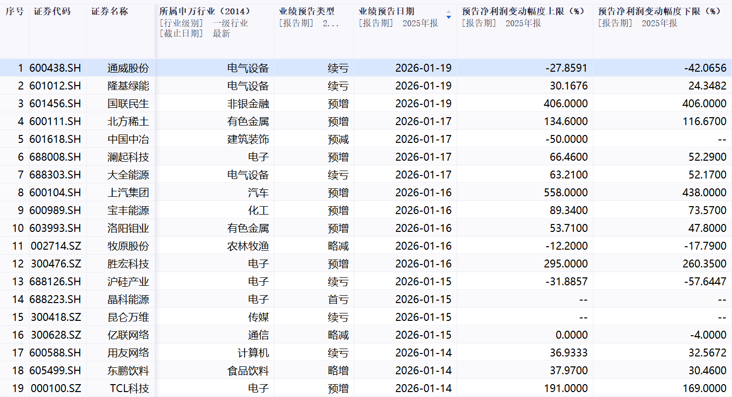 截至1月19日盘前,沪深300指数成分股共有33家预披露2025年度业绩预告,另有6家披露2025年度业绩快报,预披露占比达13%。其中,上汽集团)