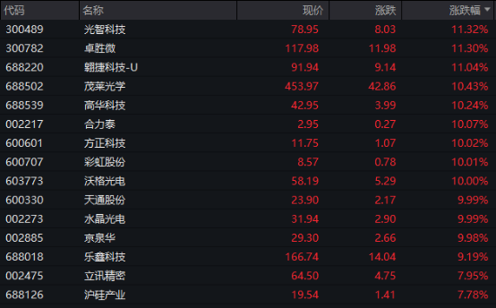 TMT赛道上行,其中电子板块领涨,板块盘中涨幅超过1.7%,该板块内个股掀起涨停潮。光智科技、卓胜微、翱捷科技-U、茂莱光学、高华科技等多股盘中涨幅超过10%;合力泰、方正科技、彩虹股份、沃格光电、天通股份、水晶光电等多股涨停。