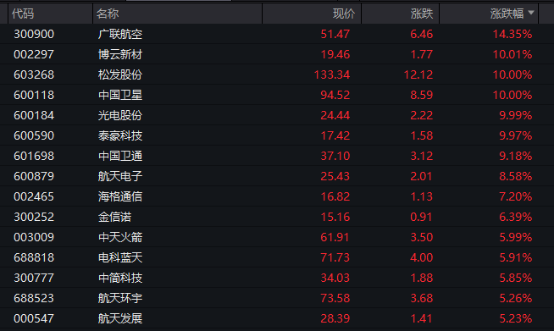主要行业板块和赛道方面,若按照申万一级行业划分,国防军工板块领涨,板块盘中涨幅超过3%。广联航空涨幅超过14%,博云新材、松发股份、中国卫星、光电股份等多股涨停,另有10多只个股盘中涨幅超过5%。